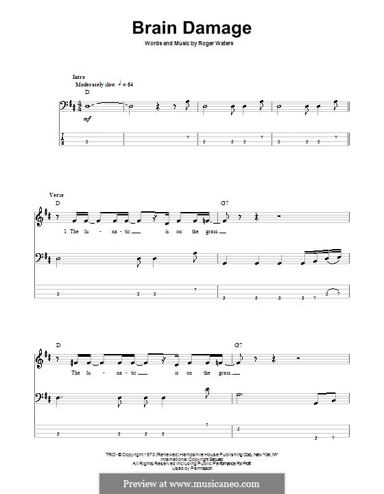 (Pink Floyd) intro(rhythm guitar) Brain Damage. Words and Music by Roger Waters. D G7/D. The lunatic is on the grass. D G7/D. The lunatic is on the grass. D in the "just chords" acoustic version, or the regular "real" version): ... Fetch Document